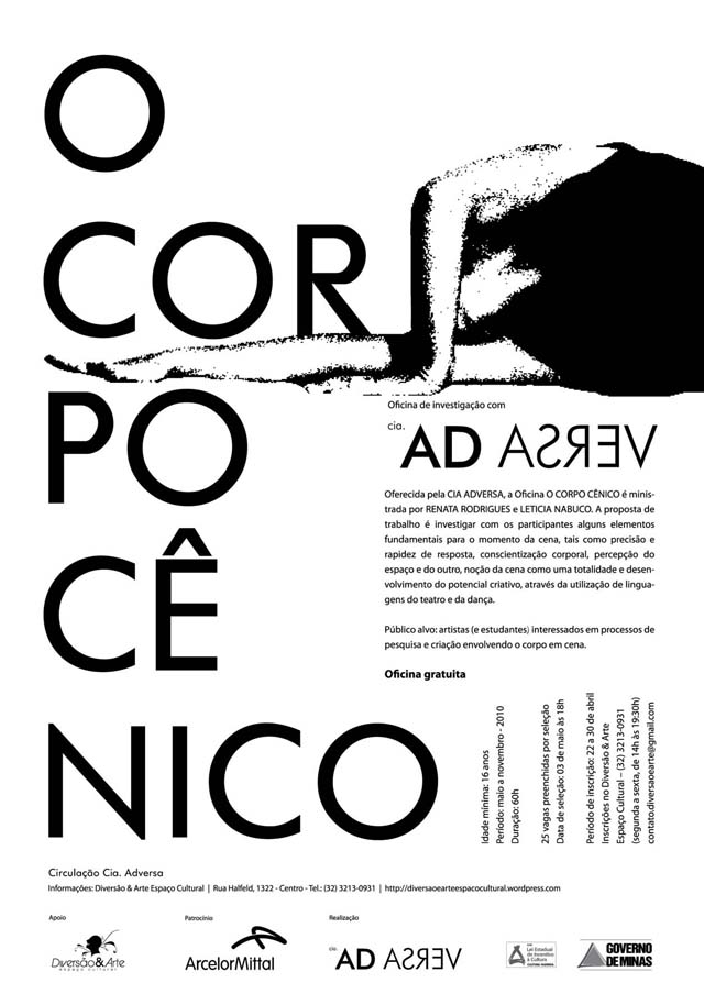 o corpo cênico – oficina de investigação com cia adversa Publicado porleticia nabuco21/04/201021/01/2015Publicado em2010, Cia Adversa, consciência corporal, dança, oficinas e práticas, teatro Arcelor Mittal e Cia Adversa oferecem: Compartilhe isso:Compartilhar Clique para enviar um link por e-mail para um amigo(abre em nova janela) E-mail Clique para compartilhar no X(abre em nova janela) 18+ Clique para compartilhar no Facebook(abre em nova janela) Facebook Curtir Carregando... Relacionado