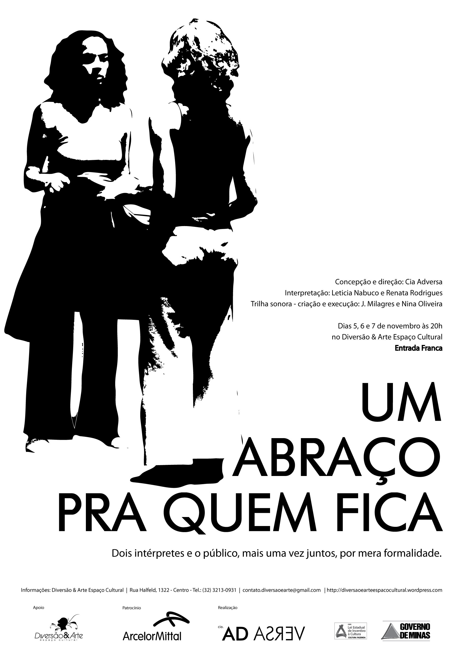 UM ABRAÇO PRA QUEM FICA – espetáculo Cia Adversa:: 5, 6 e 7/11 Publicado porleticia nabuco03/11/201021/01/2015Publicado em2010, Cia Adversa, dança, evento, teatro Arcelor Mittal apresenta: Compartilhe isso:Compartilhar Envie um link por e-mail para um amigo(abre em nova janela) E-mail Compartilhar no X(abre em nova janela) 18+ Compartilhar no Facebook(abre em nova janela) Facebook Curtir Carregando... Relacionado