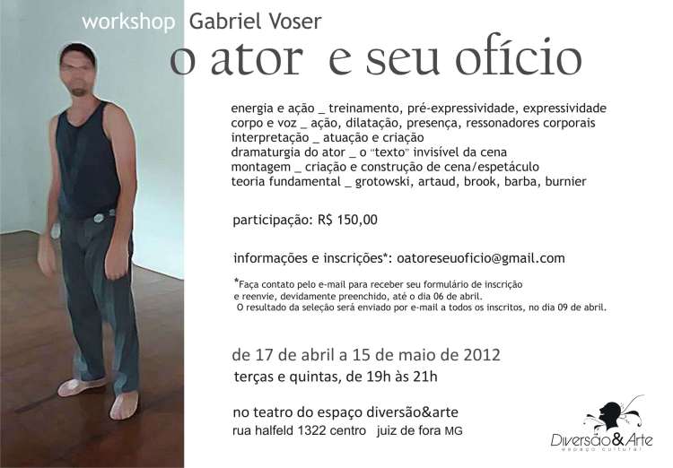 O Ator e seu Ofício – workshop com Gabriel Voser::inscrições abertas! Publicado porleticia nabuco27/03/201221/01/2015Publicado em2012, oficinas e práticas, teatro Compartilhe isso:Compartilhar Clique para enviar um link por e-mail para um amigo(abre em nova janela) E-mail Clique para compartilhar no X(abre em nova janela) 18+ Clique para compartilhar no Facebook(abre em nova janela) Facebook Curtir Carregando... Relacionado