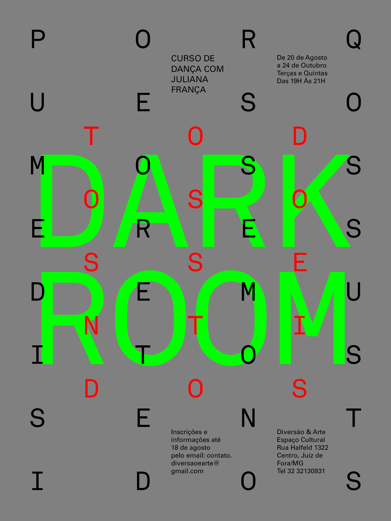 Dark Room é uma oficina de dança que têm como interesse principal rever as hierarquias dos sentidos no estudo e criação em dança, assim como na relação entre o artista e espectador. A proposta é criar ferramentas que possam diminuir a ditadura da visão e da imagem, abrindo outras portas de acesso à matéria do corpo.
